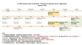 香港中文大学在线学术课程圆满结课2022.08.08-2022.08.162022年8月16日,香港中文大学在线学术课程——金融科技与其商业应用正式结课,该课程是由香港中文大学官方主办,由官方教学课程、助教课程辅导、拓展课程、港中大申请分享会、路演展示组成,主要探讨银行业、风险投资和保险业的颠覆性商业模式,以及它们如何重塑金融加密货币、区块链、人工智能和监管改革。1Pre-arrangement课程安排开课前,各位同学分别加入了不同的课程小组,下载并安装课程软件Zoom+腾讯会议客户端;班主任明确了项目期间基本纪律要求;同时发放了本次课程的课表与预习课程材料。课程表2Course review 课程回顾8月8日,香港中文大学金融科技暑期项目的第一节正式课程开始,Hugh Thomas教授主要介绍了金融科技的背景,明确了考核标准以及最终项目展示的内容与形式。接下来的课程中,Hugh Thomas教授以案例分析为主要形式,介绍了招商银行“一体两翼”战略以及招行自行研发的CBPBS系统。Hugh Thomas 教授还以Sensetime(商汤科技)公司和Bowtie保险为例,分析了人工智能A