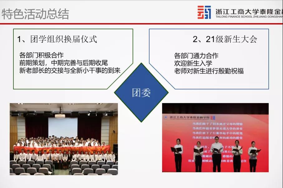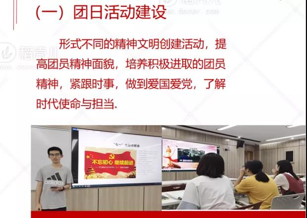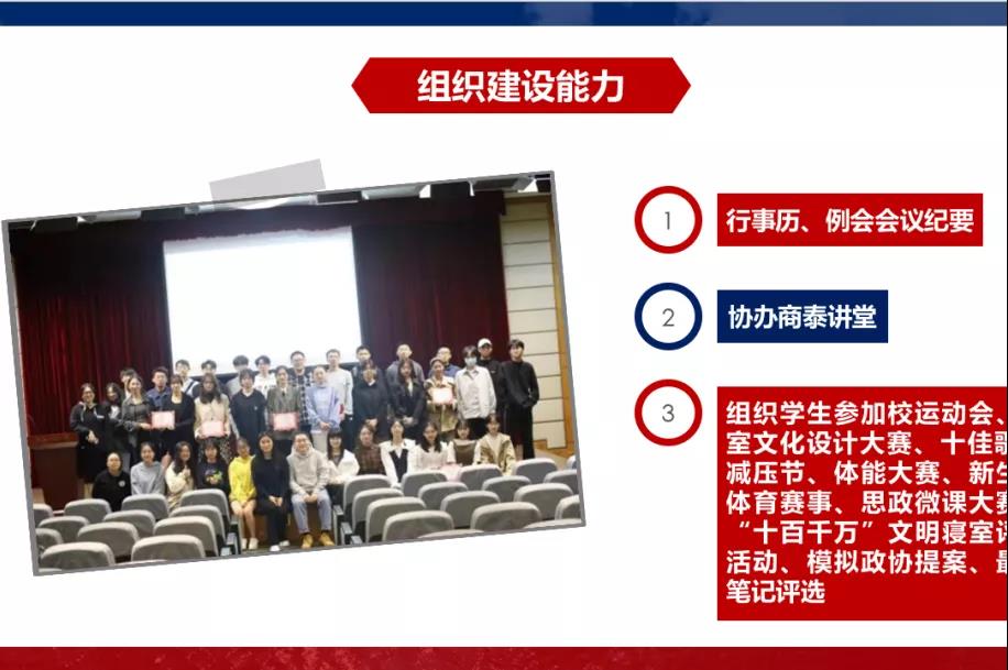 在团委述职完毕后,由各团支书逐一介绍各团支部建设情况,各班级以班团一体化为核心,建立了班团一体化工作机制。各班团支书系统性地总结了在过去的一年中,班团建设的一些经验方法,如进行学风建设、氛围建设等班级特色,同时也反思了班团建设中的不足,并提出了改进的建议和未来规划。