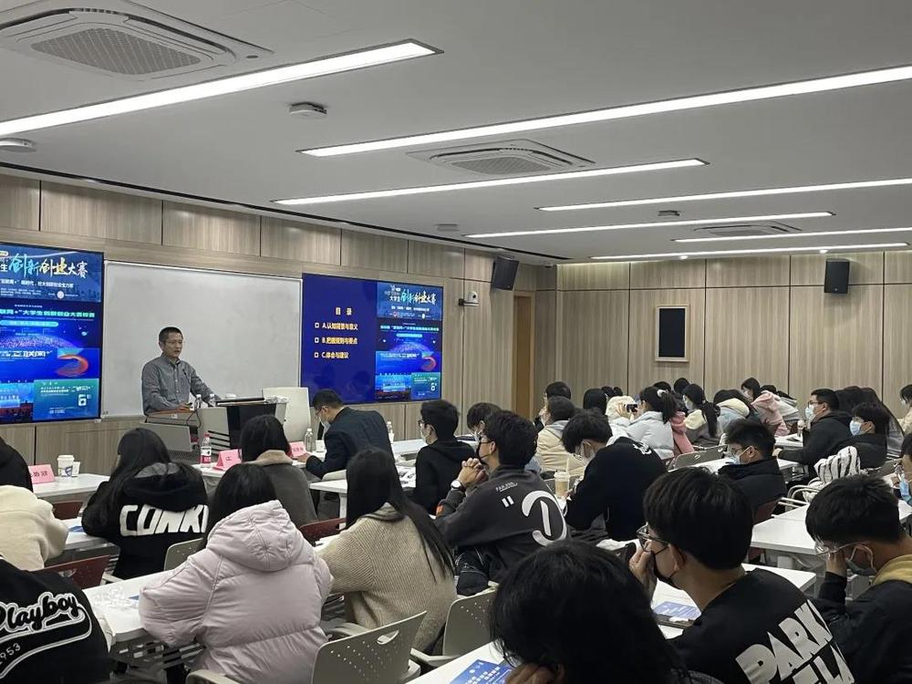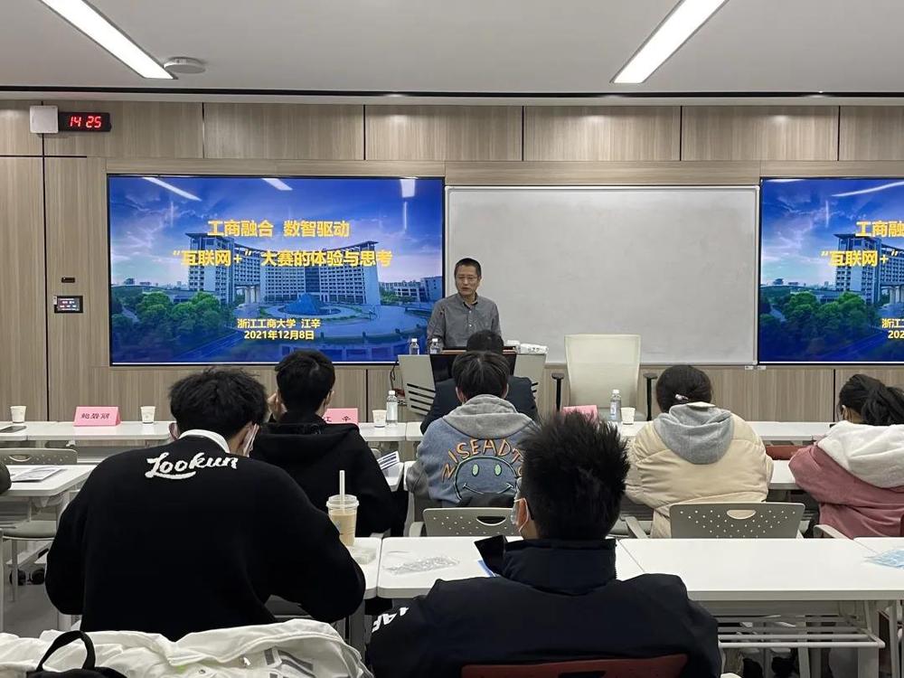 江辛院长首先讲解了“互联网+”大赛的发展现状和意义。由于高校培养“创新型、复合型、应用型人才”的新趋势、高校教师发展的新要求,“互联网+”大赛逐渐受到政府和高校的高度重视,近年来得到迅速发展。然后江院长介绍了大学生学科竞赛的体系,通过分析以往七届“互联网+”大赛的参赛学校数量、项目申报数量、参与人次等数据,说明“互联网+”大赛在学科竞赛体系中的重要地位。接下来江辛院长详细讲解了“互联网+”大赛的规则和要点,主要包括赛道与组别分类、项目方向梳理、评审要点三个方面,期间江院长还对全国以及浙江省内高校获奖情况和本校竞赛状况进行了分析。