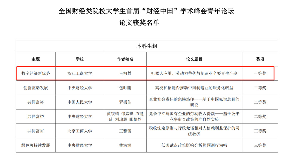 okpay钱包app 王柯哲同学的论文《机器应用、劳动力替代与制造业全要素生产率》入围62篇优秀论文并做分论坛报告,最终获得本科生组唯一的一等奖。
