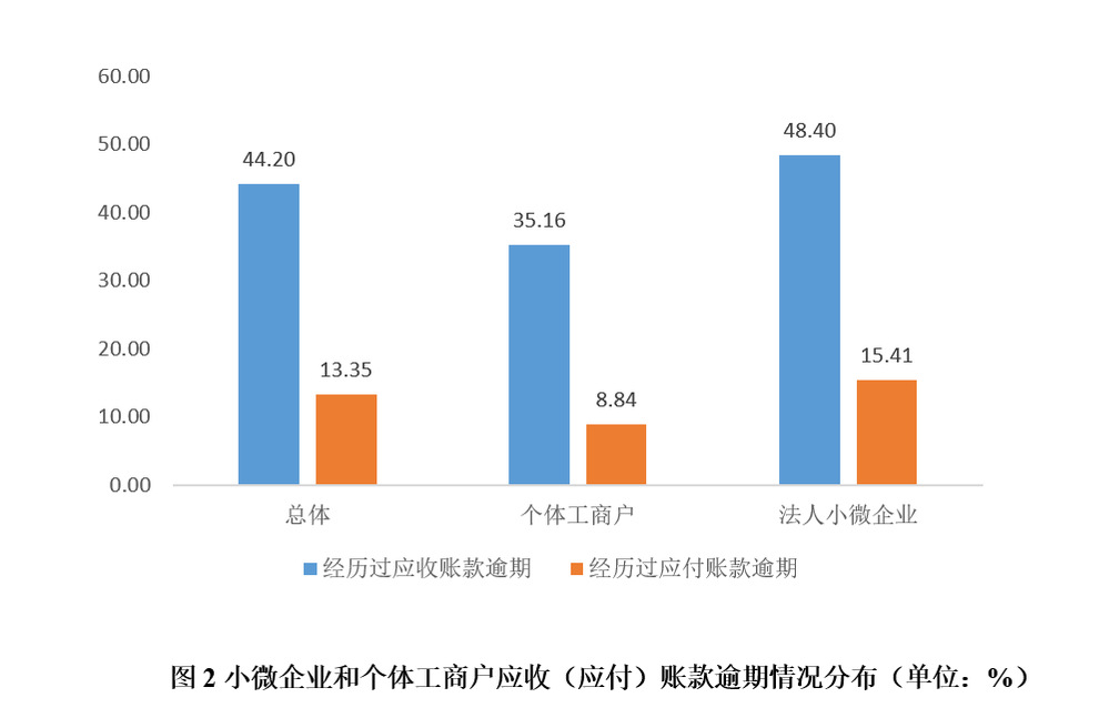 如图1和图2所示,47.79%的小微企业和个体工商户有应收账款,32.00%的小微企业和个体工商户有应付账款; 44.20%的小微企业和个体工商户经历过应收账款逾期,而只有13.35%的小微企业和个体工商户经历过应付账款逾期。可见,小微企业的应收账款与应付账款存着错配,具体表现为有应收账款的小微企业和个体工商户比例远高于有应付账款的小微企业和个体工商户比例,且面临应收账款逾期的小微企业和个体工商户比例远高于应付账款逾期的小微企业和个体工商户比例。因此,小微企业会经常面临流动性资金需求。