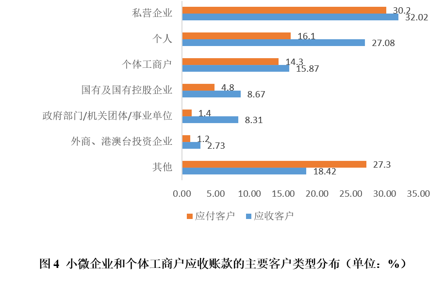 从客户类型来看,无论是应收账款还是应付账款(图4),客户类型为私营企业的小微企业和个体工商户比例最高;接下来依次是客户类型为个人、个体工商户、国有及国有控股企业、政府部门/机关团体/事业单位和外商、港澳台投资企业的小微企业和个体工商户。