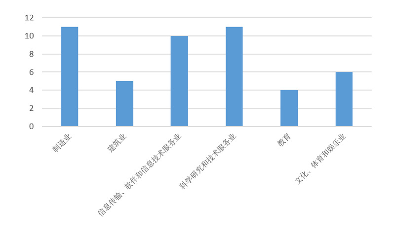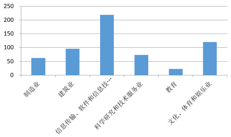 调查数据显示,有研发创新活动的小微企业比例为32%,且行业间存在较大的差异,其中信息传输、软件和信息技术服务业中有研发创新活动的小微企业占比接近60%,而文化、体育和娱乐业的占比低于25%。图3为分行业研究人员数量分布,制造业和科学技术服务业平均专职研发人员数量为11人;信息传输、软件和信息技术服务业平均拥有10位专职人员。图4为分行业研发资金投入分布,信息传输、软件和信息技术服务业资金投入最高,达到220万元;其次为文化、体育和娱乐业,研究支出约120万元;制造业和科学技术服务业的研发支出则分别为62万元和72万元。
