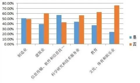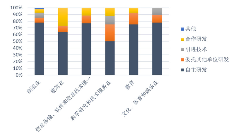 调查结果显示,自主研发是小微企业创新活动的主要方式。其中,制造业,信息传输、软件和信息技术服务业以及文化、体育和娱乐业自主研发的企业比例均在80%左右;科学技术服务业自主研发比例为50%,委托其他单位研发比例约为30%,可能的原因之一是科学技术服务业的自主研发的门槛较高,而小微企业相关研发能力相对薄弱。