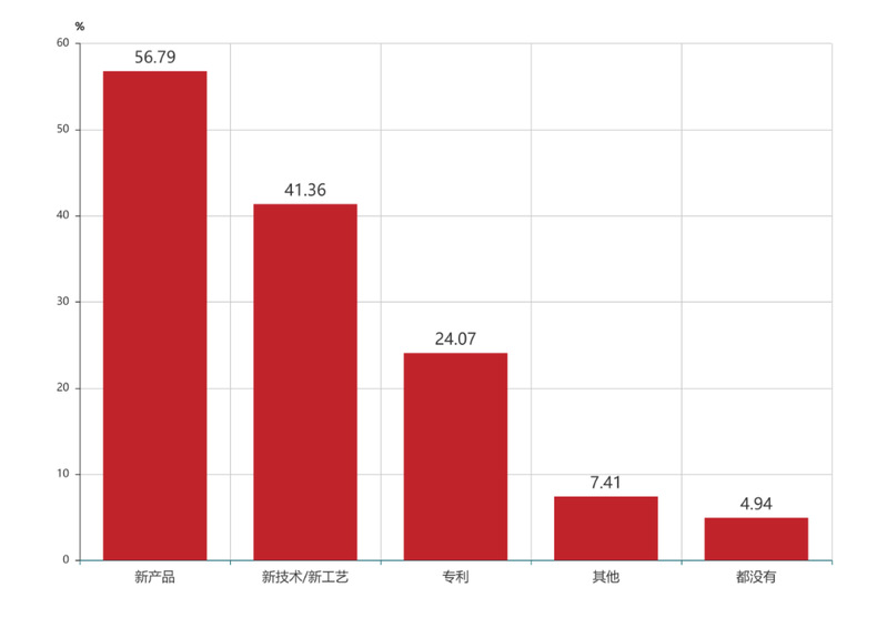 调查结果显示,在有研发创新支出的小微企业中,研发创新转化为新产品的企业比例为56.79%,转化为新技术/新工艺的比例为41.36%,转化为专利的比例占比24.07%。该结果表明,小微企业创新相对务实,研发创新主要转化为新产品。此外,有5%的小微企业研发创新支出没有转化结果,该结果在一定程度上表明小微企业承担高风险创新活动意愿不强。