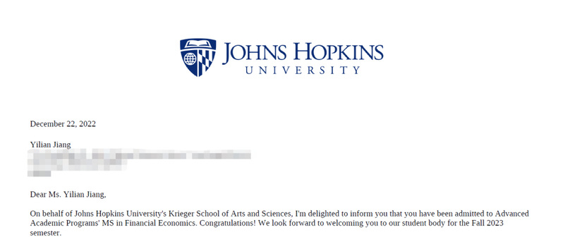 优秀校友风采展示丨19级毕业生蒋伊莲:海压竹枝低复举,风吹山角晦还明——获得约翰霍普金斯大学offer