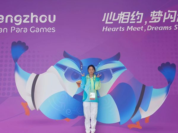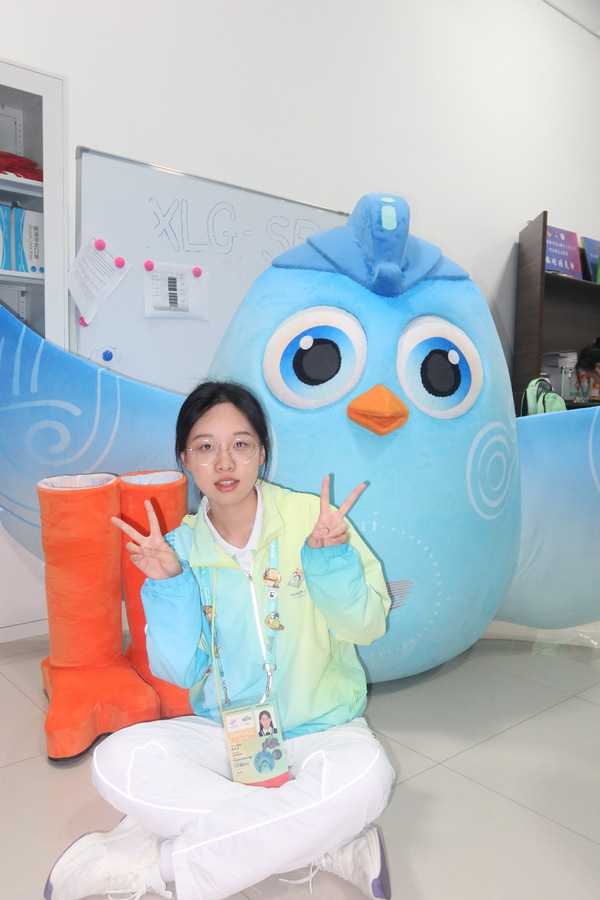 很荣幸参加了亚残运会,我所服务的领域是观众服务。一开始得知我的工作是吉祥物表演员的时候,我其实是有点担心的,怕自己体力不够,因为吉祥物表演需要一直带着头套,不停得跟观众互动。实际上岗的时候虽然感觉到头套也很重,里面非常闷热,但是每次跟观众合完影,都能听到他们的感谢,也会夸赞这个吉祥物可爱又灵动,他们的快乐感似乎能透过头套传递到我的身上,尽管每次下班脱下头套都大汗淋漓,但也十分满足。亚残五天的志愿虽然忙碌但却充满了意义!