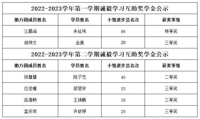 根据《okpay钱包下载 “勤朴学习优秀奖学金和诚毅学习互助奖学金”评审管理办法》,2022-2023学年两个学期均有学生自愿报名组成互助小组,互助学习,共同进步,okpay钱包下载 根据基本条件审核以及各小组专业素质合计排名进步情况,评选出特等奖1组、二等奖1组、三等奖4组。
