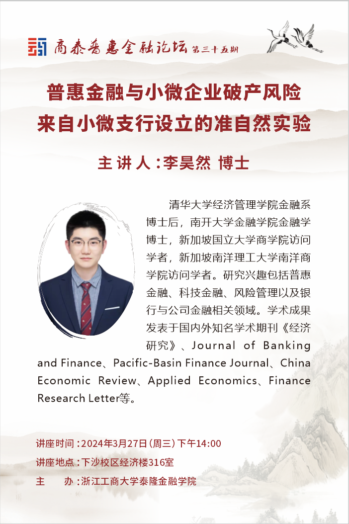 讲座预告|普惠金融与小微企业破产风险——来自小微支行设立的准自然实验