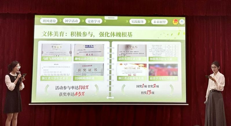 三折屏,怎么折都有面。第一屏是学业情况,班级在两个学期的平均成绩均荣登榜首,四级通过率更是达到了完美的100%。第二屏是竞赛与实践,学科竞赛中荣获超过三十项荣誉,2302班的同学们在文体活动、志愿服务和学生工作中都有所作为,实现了全方位的成长。第三屏是班级氛围,通过丰富多彩的团建活动和班级风采Vlog的拍摄,同学们之间的情谊得到了加深和巩固。展望未来,相信这样的多元发展和团结协作将引领2302班继续在学术和生活中取得更多成就,共同书写更加辉煌的篇章。