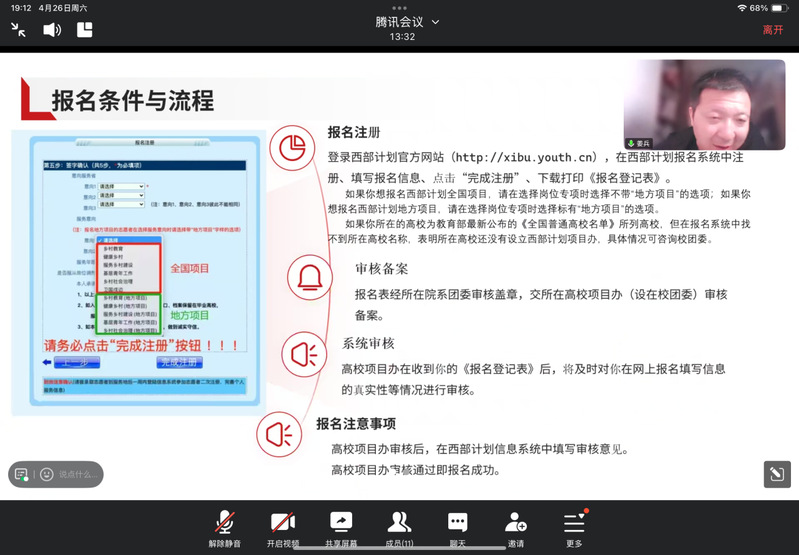 分享会伊始,姜兵老师深入解读了大学生志愿服务西部计划的最新政策,详细介绍了西部计划的实施情况,从岗前准备、报考流程到生活保障等方面一一进行答疑解惑。
